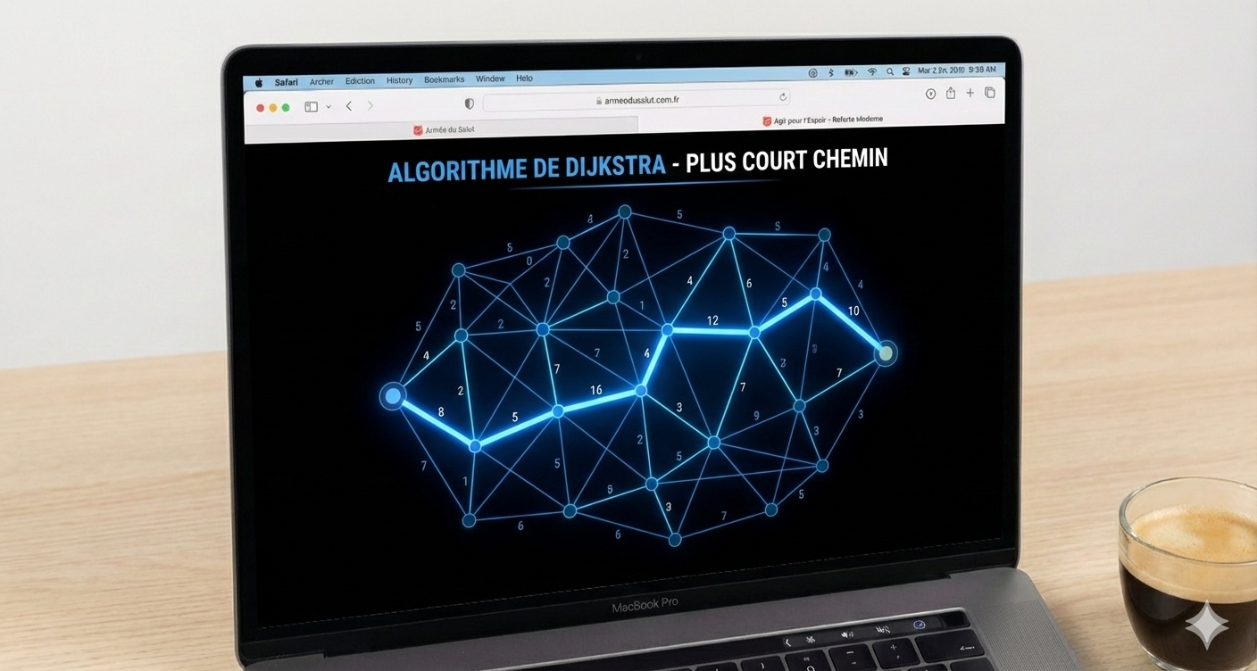 Algorithme de recherche du plus court chemin dans un graphe pondéré, utilisé pour trouver le trajet optimal entre deux nœuds, avec visualisation dans un labyrinthe.